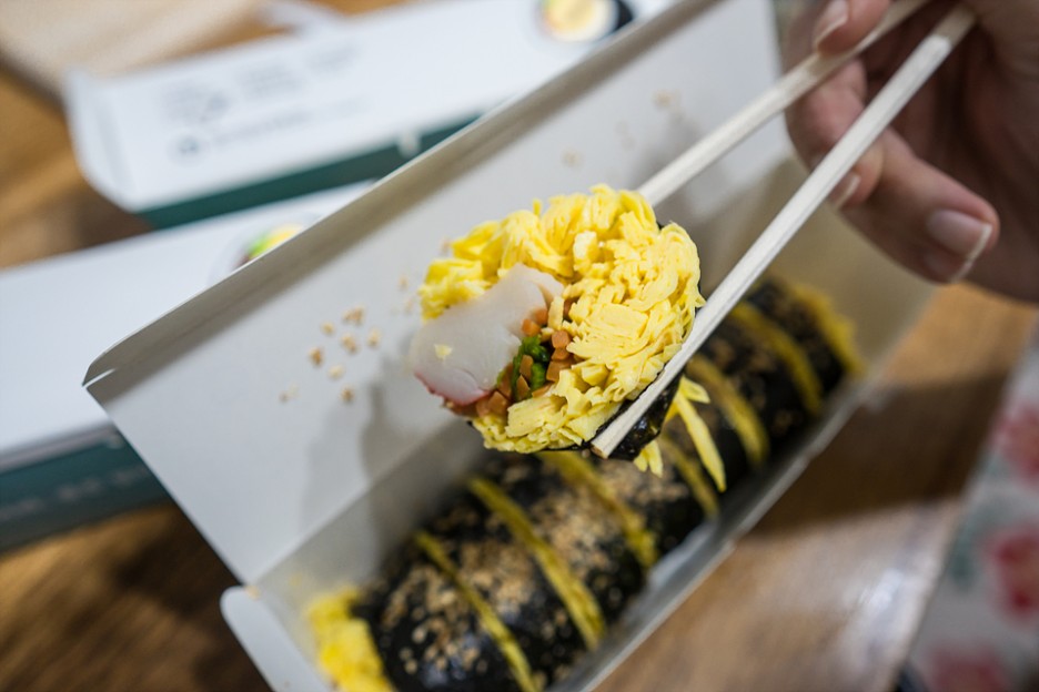 일반적인 김밥에 비해 계란이 매우 많이 들어가는 보슬보슬의 김밥.